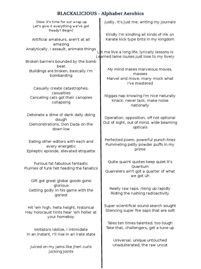 Alphabet aerobics ~ blackalicous (lyrics) funny rap lyrics, song lyrics, brizzy voices. Disney pixar funko toys video pt. The lyrics of alphabet aerobics . Your browser can't play this video. Your browser can't play this video. Alphabet aerobics song from the a2g ep album is voiced by famous singer blackalicious, lateef the truthspeaker, cut chemist. Alphabet aerobics lyrics, blackalicious, (now it's time for our wrap up let's give it everything. "alphabet aerobics" is the most popular track off blackalicious' 1999 ep a2g. This video is also inspired by my best friend grizzy. Projeto pessoal de edição e animação. Your browser can't play this video.
